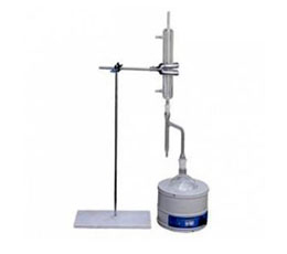 4、將儀器裝置如圖,先將洗凈并烘干的水分接受器的支管緊密的安裝在玻璃燒瓶上,使支管的斜口進入燒瓶15-20cm;然后在接受器上連接冷凝管,冷凝管的內(nèi)壁要預先用棉花拭干。安裝時,冷凝管與水分接受器的軸心線要相重合,冷凝管下端的斜口切面要與接受器的支管管口相對。為避免蒸氣逸出,應在冷凝管的上端用棉花塞著,以免空氣中的水蒸氣進入冷凝管凝結。