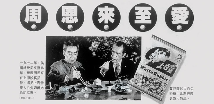 1972年美國總統(tǒng)尼克松訪華期間,其隨行人員先行來到上海,覺得大白兔奶糖香甜可口,就推薦給了尼克松。尼克松吃后也非常喜歡,周總理知道后,當(dāng)即批示將大白兔奶糖作為禮物送給尼克松。 大白兔作為國禮贈送美國總統(tǒng)后,海外市場的大門欣然為大白兔開啟,在其他國家也受到人們的追捧。周總理還把大白兔奶糖送給前蘇聯(lián)領(lǐng)導(dǎo)人。