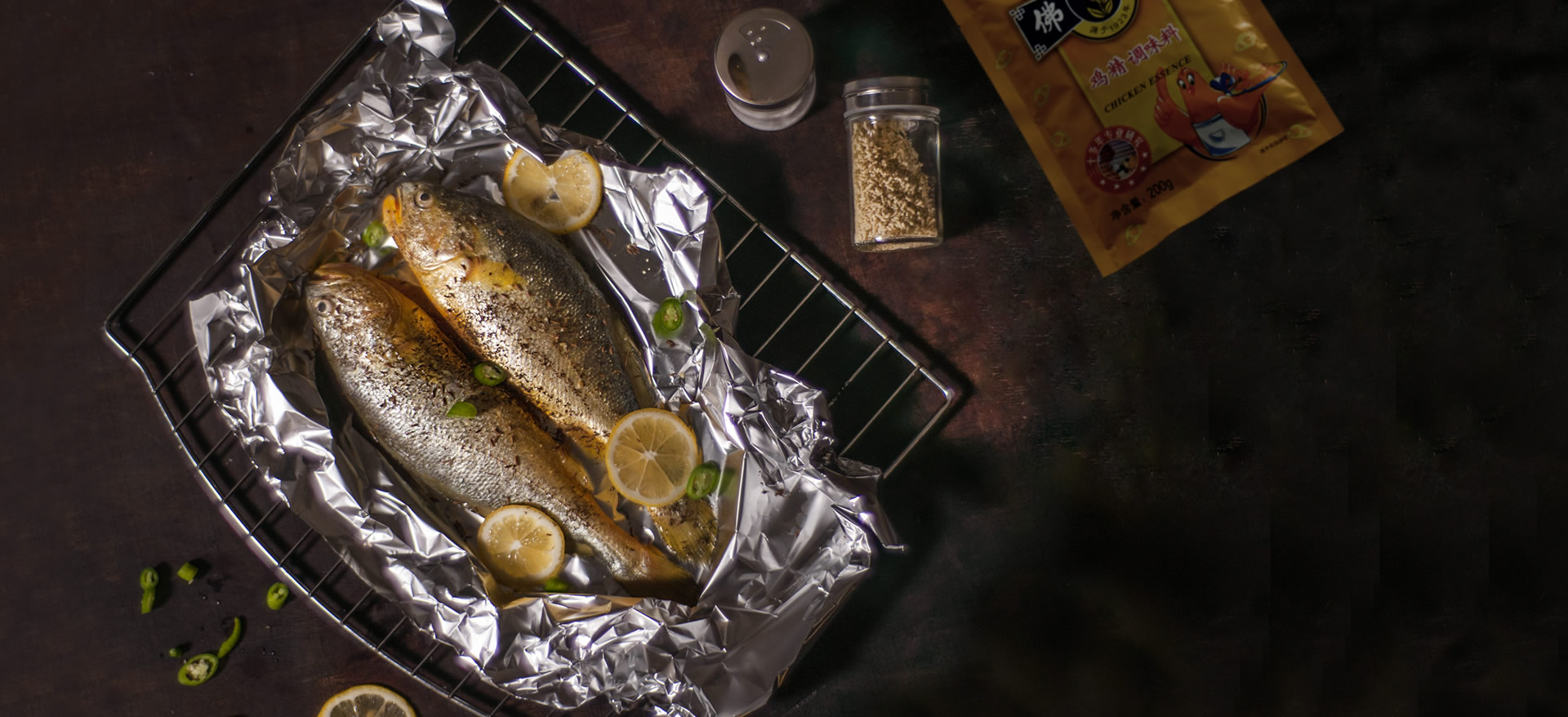 烤出來(lái)的魚肉質(zhì)細(xì)嫩,再加上一勺蔥油和胡椒提味