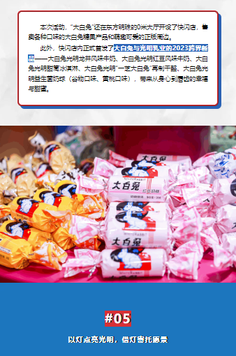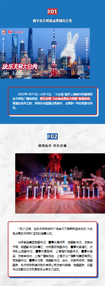 2023年1月17日——2月15日,“大白兔”攜手上海城市明星地標東方明珠廣播電視塔 聯合呈現“大白兔點亮東方明珠”新春活動 希望在兔年之際,用快樂和甜蜜點亮城市、點亮新一年的希望與快樂。
